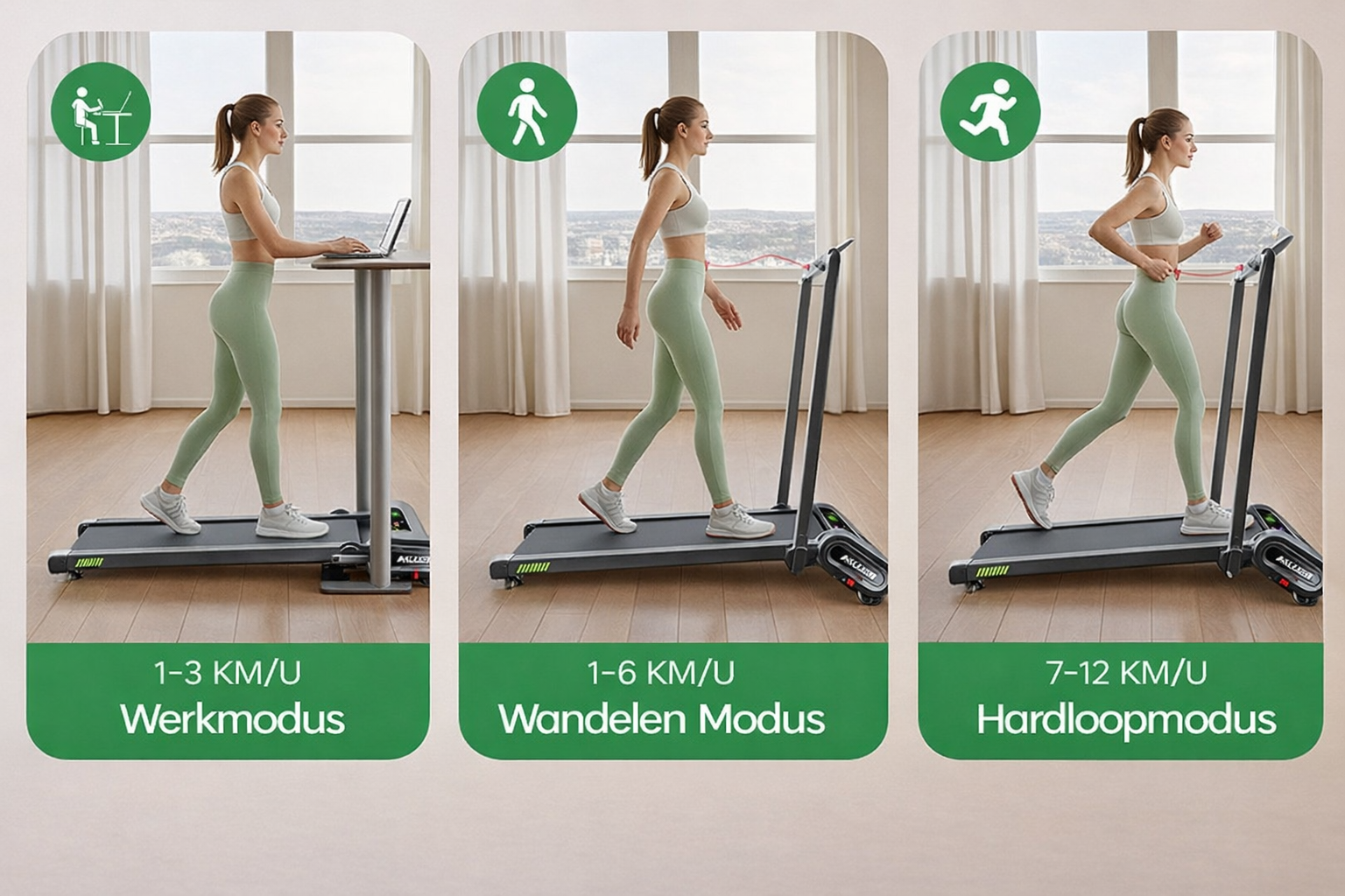 Je plaatst de loopband onder een bureau en loopt tijdens het werken. De handrail klap je eenvoudig in. De motor blijft stil zodat je kunt blijven typen of bellen zonder afleiding.